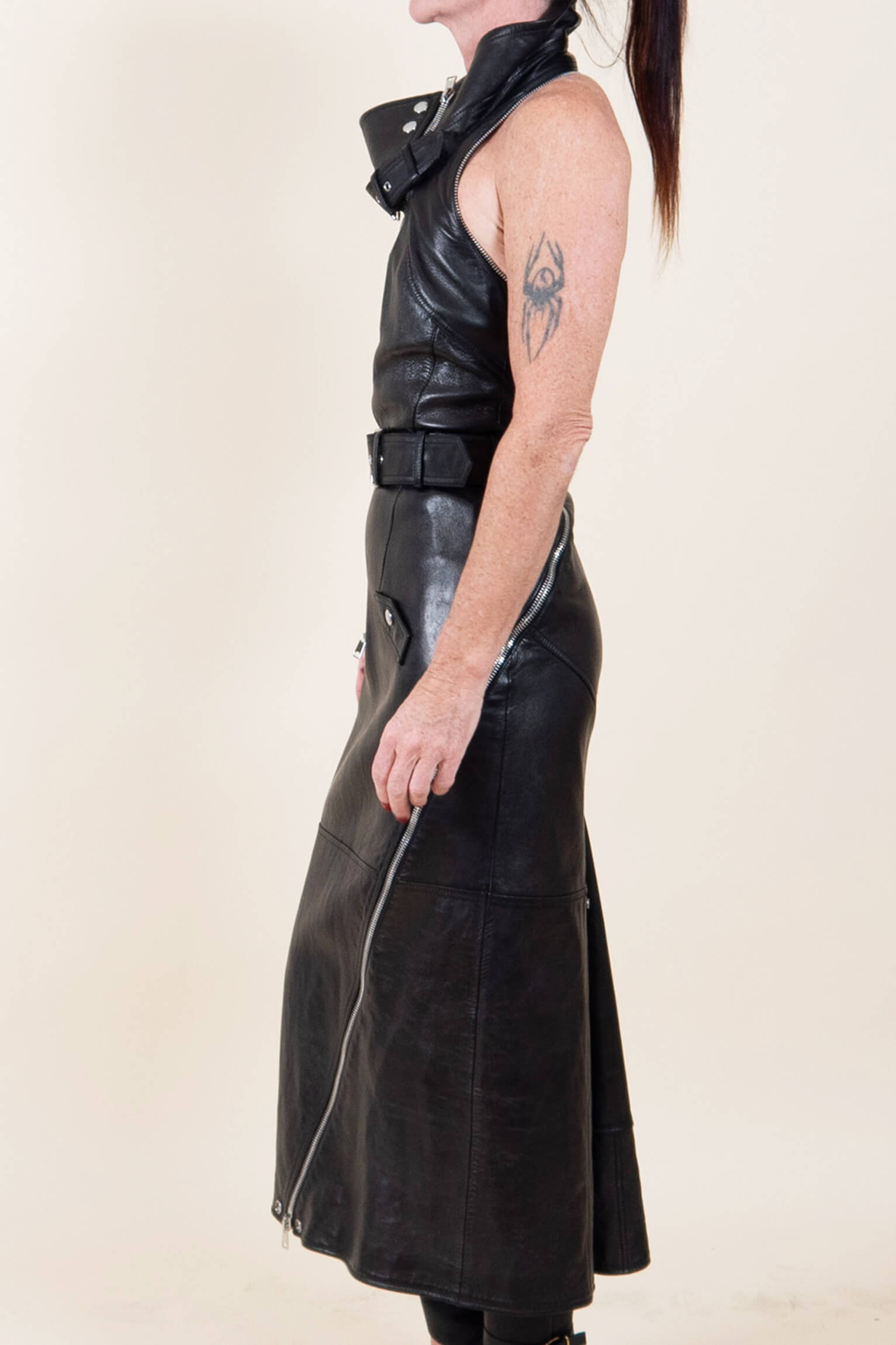 Alexander McQueen Long Black Leather Dess with Zip Detail and Cowl Neck