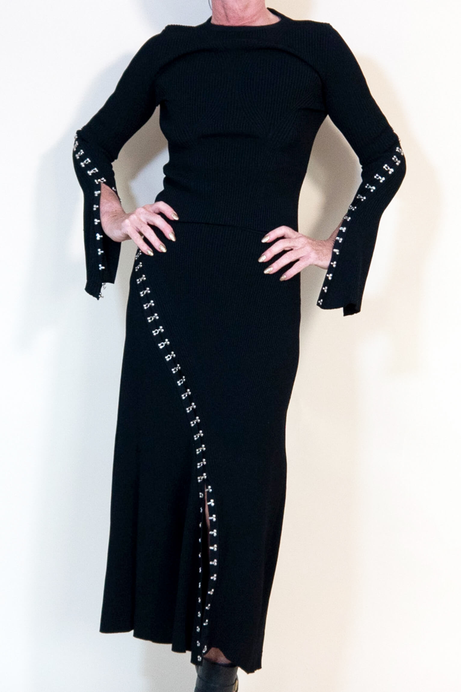 This is a very fitted long skirt and top. Clings to the figure and is definitely very unique. The hooks and eyes all down the sides are every eye catching. The from is split up to the knee. Is beautiful when you walk. A beautiful knitted outfit.