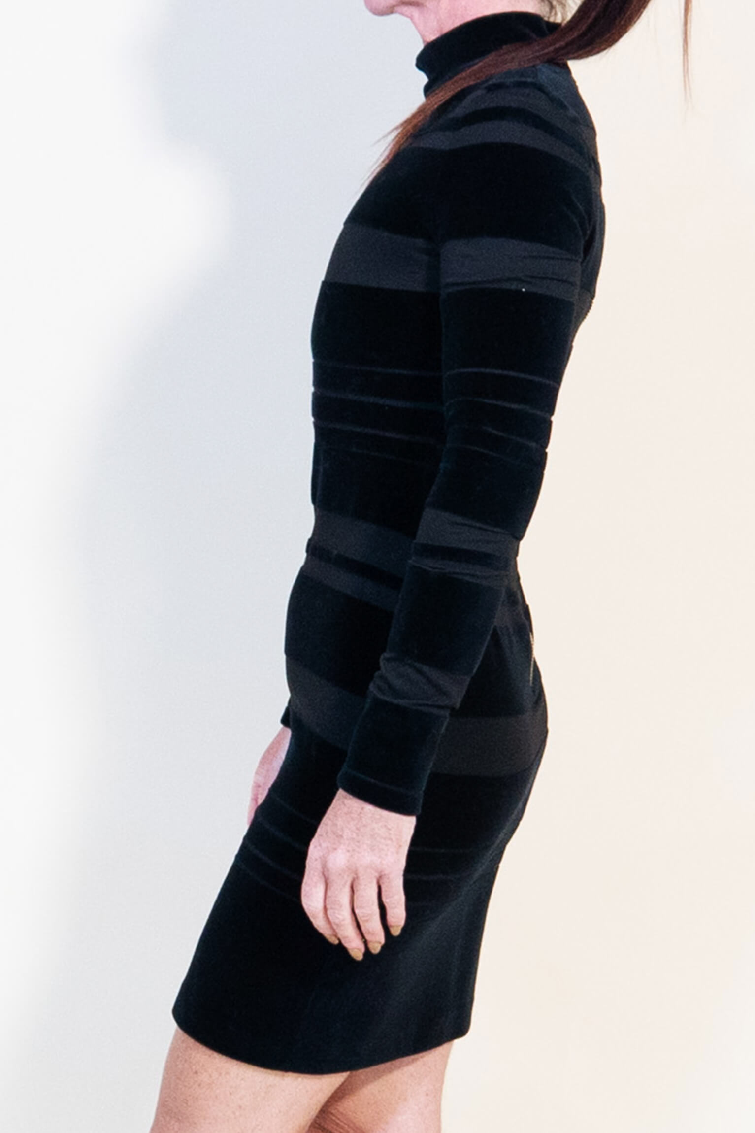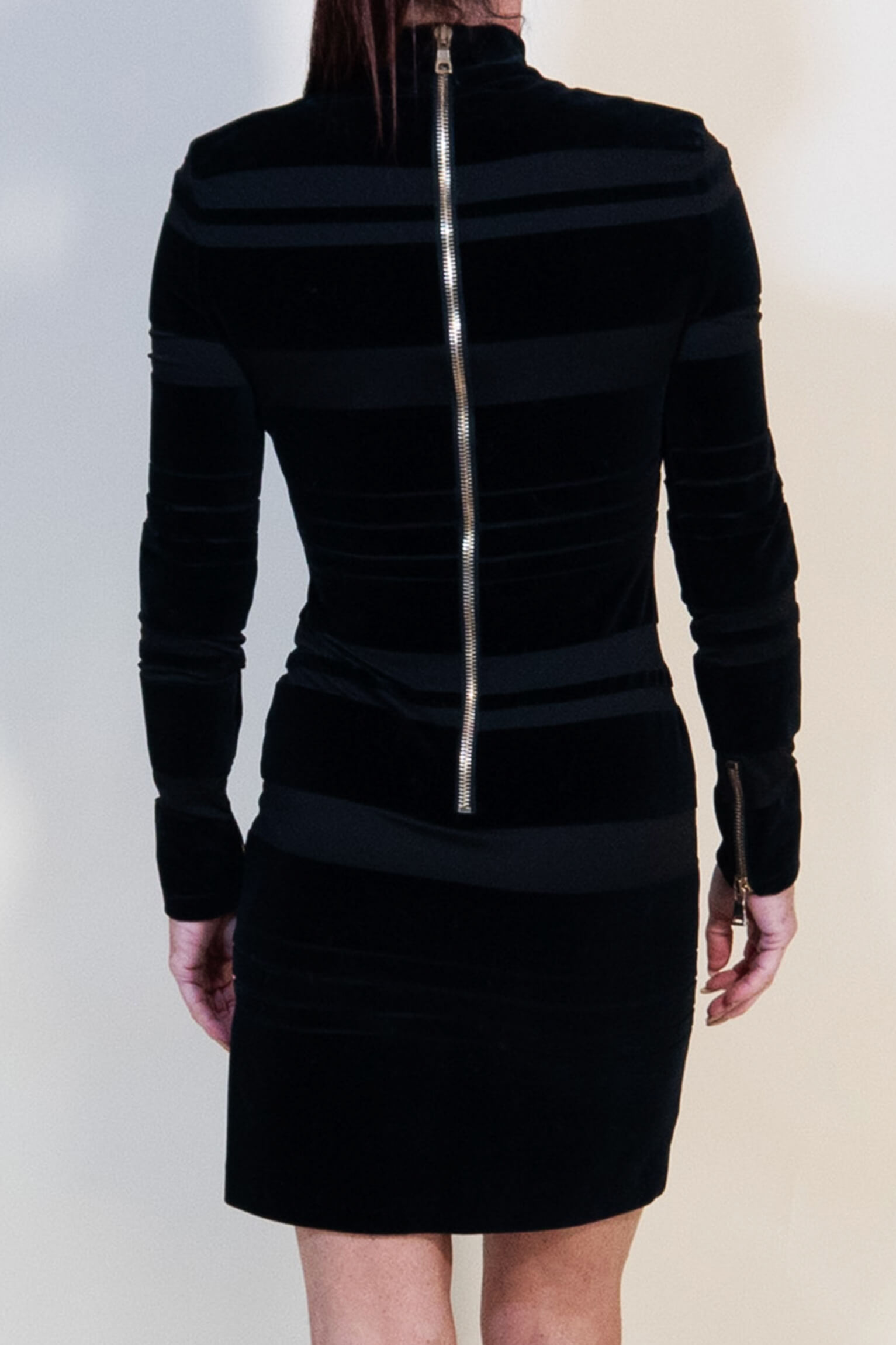 Balmain Plain Black Velvet Dress with Horizontal Mesh Stripes