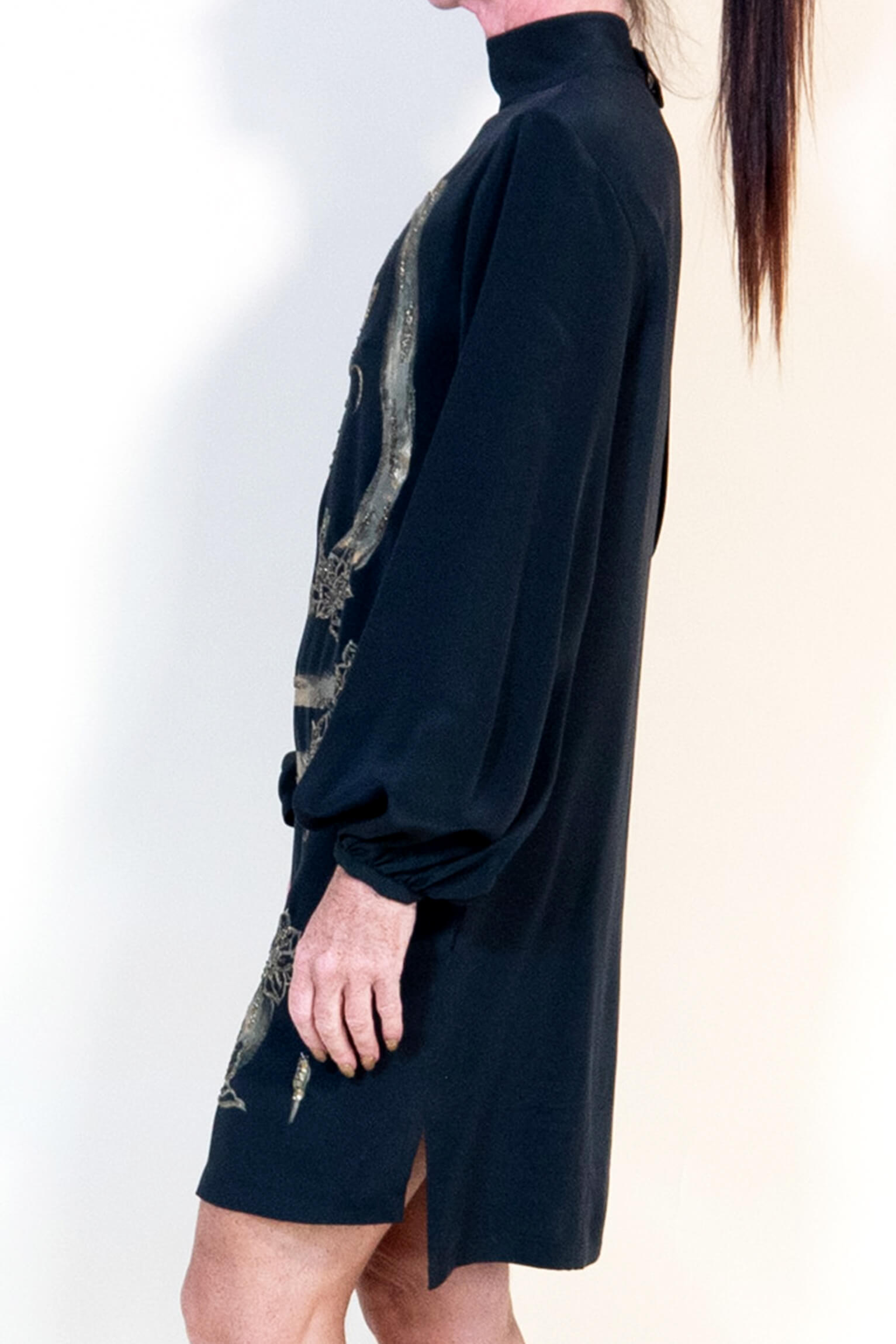 Soft, floaty and loose Emilio Puci dress with embroidered gold dragon. Very striking but demure and sophisticated.