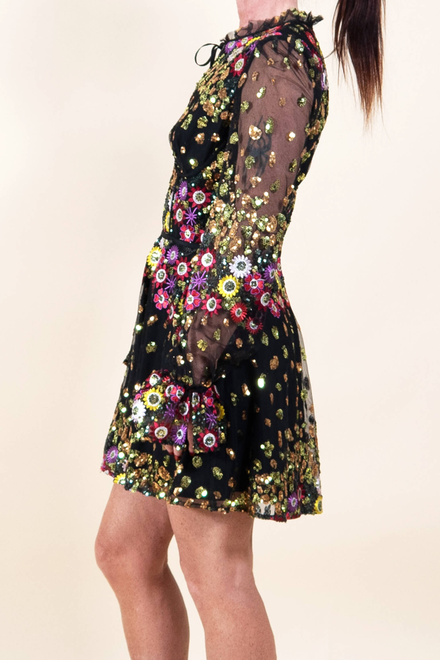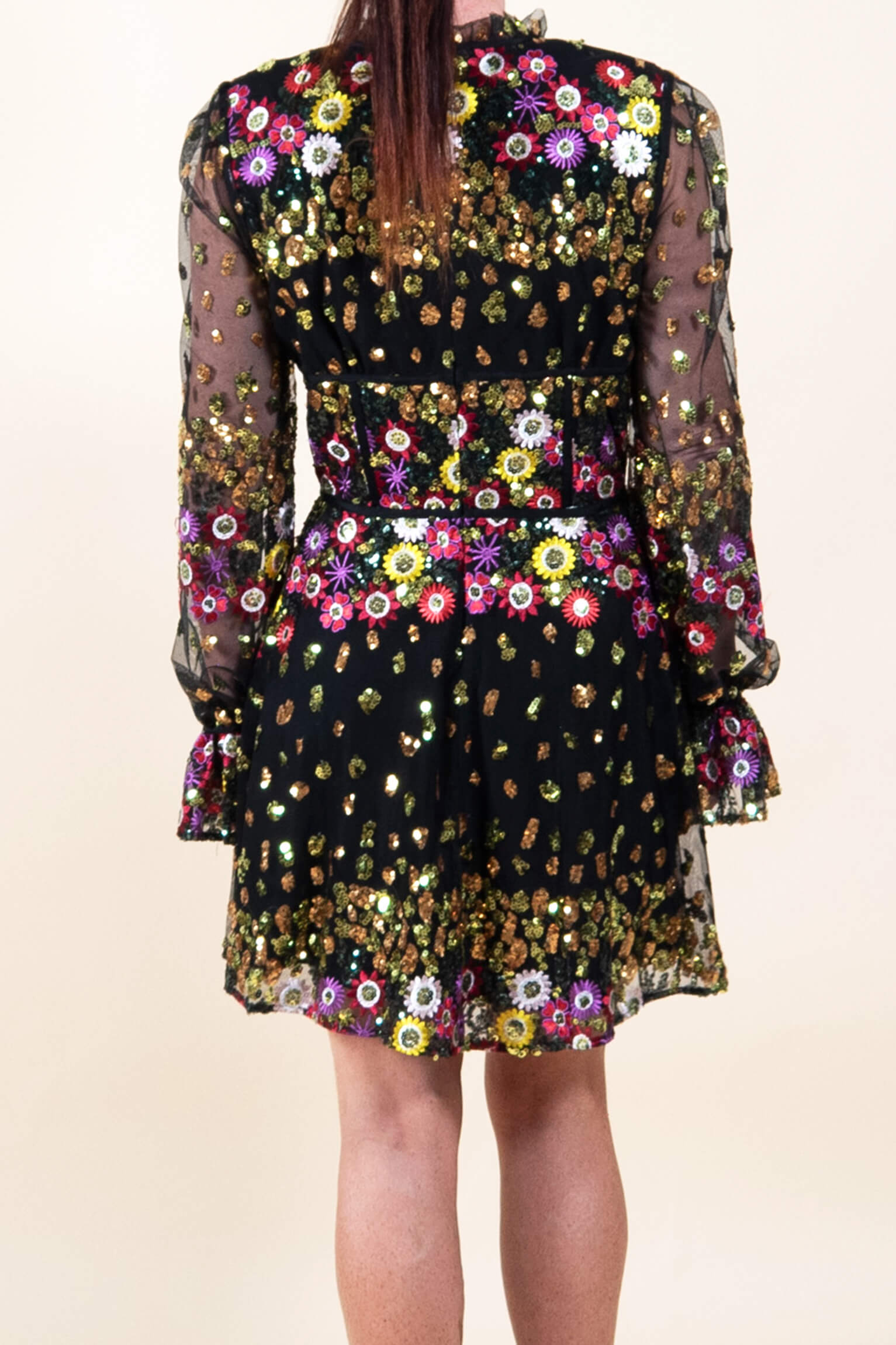 A lovely sparkly little dress with lots of embellishments, a real head turner. Sparkles amazingly in the sunshine. Can dress up or down with footwear/ black denim jacket.