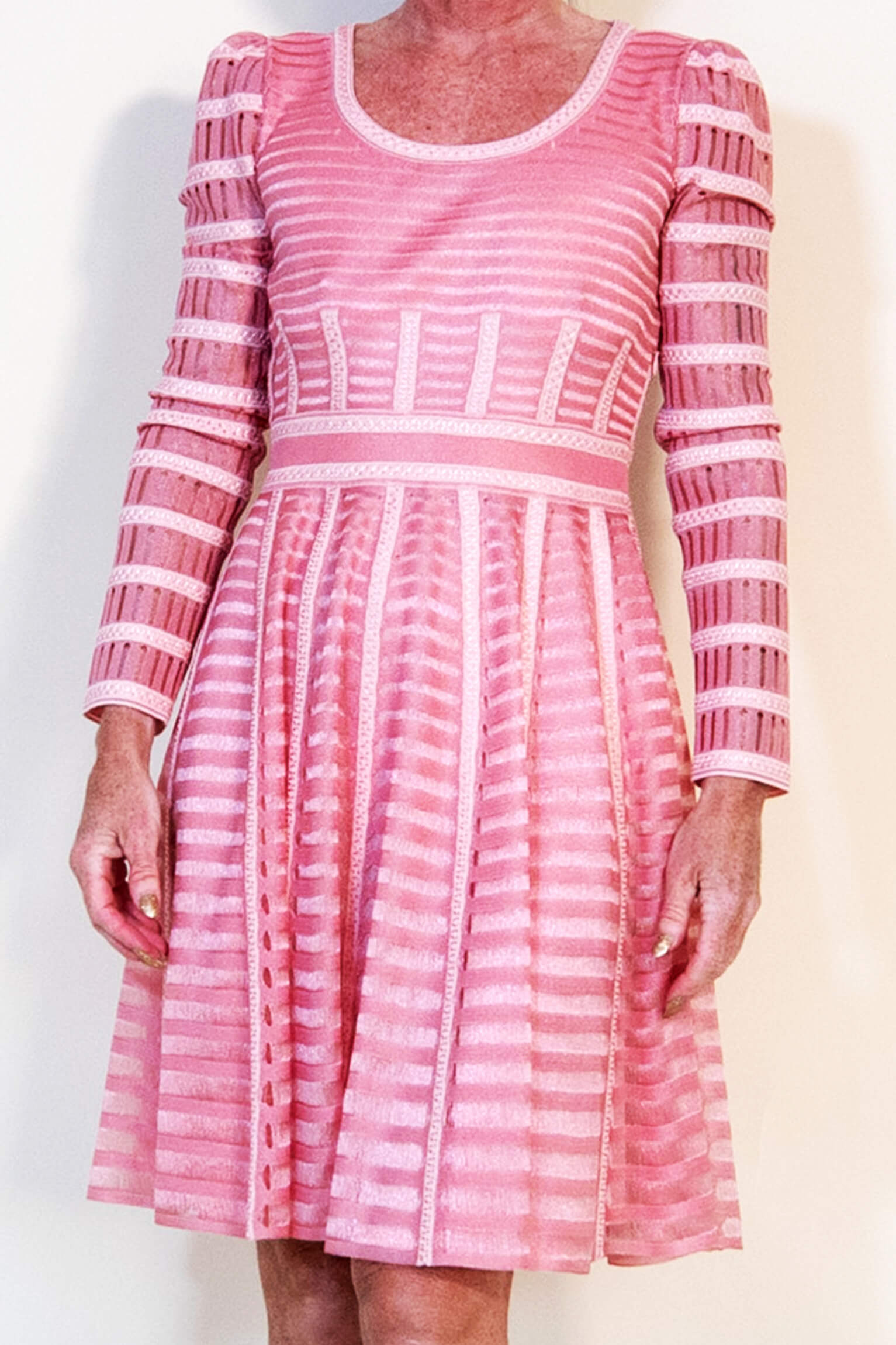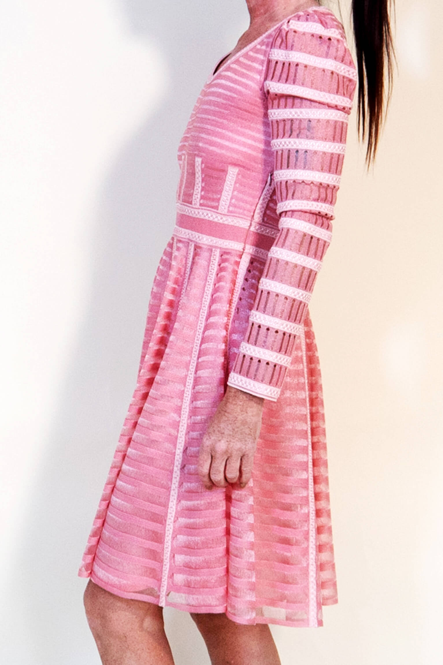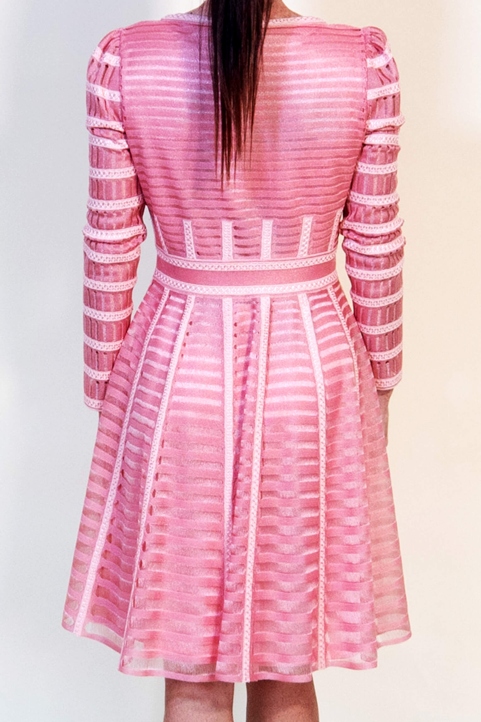 This little dress is extremely pretty but bit more toned down. The pink is a candy floss pink and lots of horizontal little mesh striped sections means it drapes on the body beautifully and moves beautifully with the body. Very elegant.